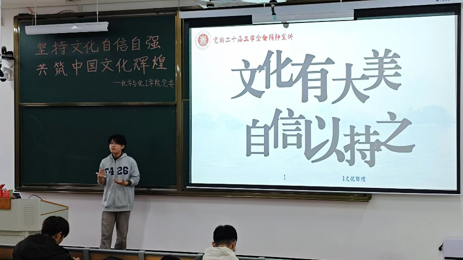 11月5日下午,化学与化工学院邀请中北大学二十届三中全会宣讲团成员刘茗洋以“坚持文化自信自强,共铸中国文化辉煌”为主题开展宣讲活动,化学与化工学院党支部书记、全体学生党员参与了此次活动。