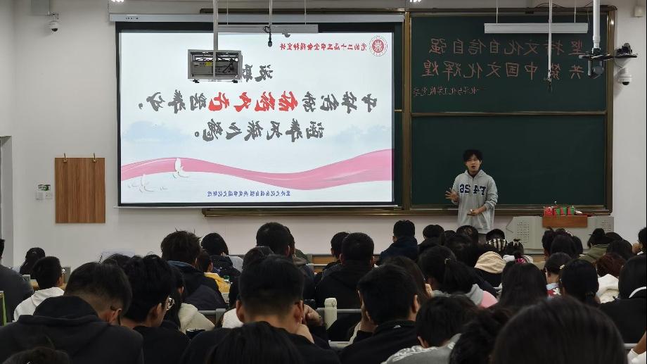 活动现场,刘茗洋首先从国产电影、综艺节目、国潮文化等案例出发,向同学们阐述了文化自信的重要意义,他强调中国式现代化是物质文明和精神文明相协调的现代化,而文化自信是一个民族、一个国家走向强盛的重要支撑,是推动精神文明发展的不竭动力。在宣讲过程中,刘茗洋还指出当代青年是坚定文化自信的关键主体,是传承发扬中国文化的关键环节,他鼓励学生们深刻理解党的创新理论的实践伟力,主动汲取中华优秀传统文化的养分,坚定理想信念,筑牢思想根基,将无私奉献、敢于斗争、忠于祖国、忠于人民作为当代青年的价值取向。