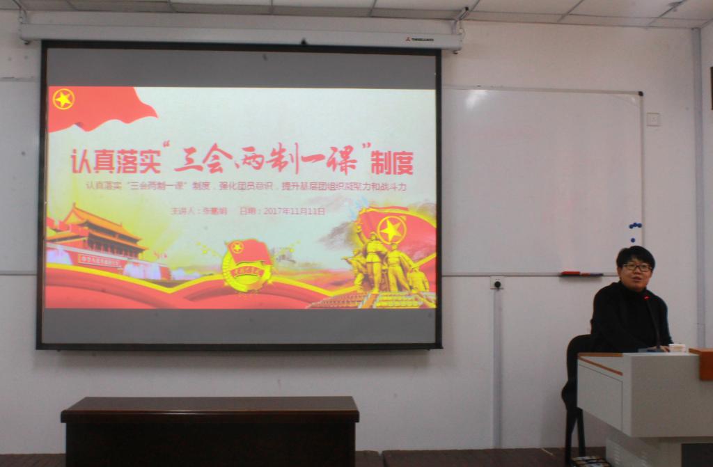 紧接着,理学院团委书记张鹏娟向学生干部深入浅出地讲解了“三会、两制一课”制度,首先从基本概念、主要任务、基本流程等几方面对支部团员大会、支部委员会、团小组、团员教育评议制度,团员年度团籍注册制度,团课等进行详细解读。张书记指出,三会两制一课不仅了强化团员意识,加强了团员思想政治教育和自我教育,更是加强了团员对共青团的认识,提升了基层团组织凝聚力和战斗力。