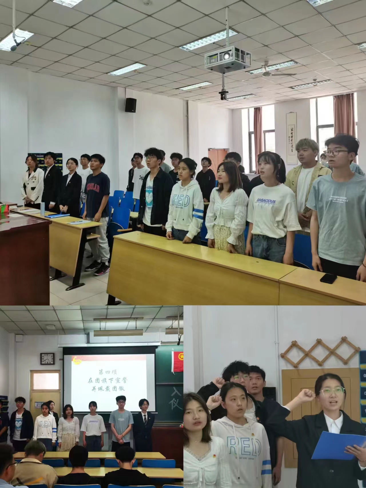 庄严的红色团旗,激昂的共青团团歌,为这次新团员入团仪式平添一份肃静。李展志同学在介绍了学生团员的发展简史之后,宣读了新团员的名单,他们是来自21级的吉潇杰同学、郭含宇同学、李霞同学和陈忠婷同学和来自22级的程浩东同学、陈昊同学、孙孜淳同学。