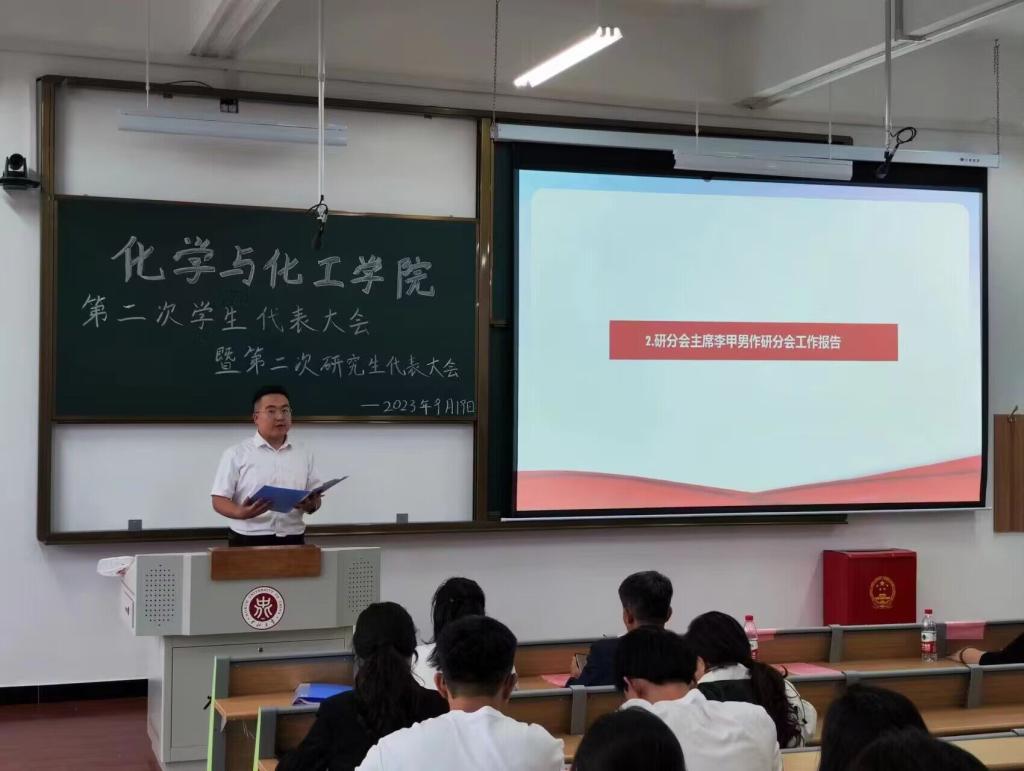 2023年9月19日下午中北大学化学与化工学院在17105H教室隆重举行中北大学化学与化工学院第二次学生代表大会暨第二次研究生代表大会。化学与化工学院党委书记吴志远,副院长胡志勇,团委书记李艳和研究生辅导员贾苗苗及全体学生代表115人参与本次会议。会议由化学与化工学院主席团成员何英华主持。