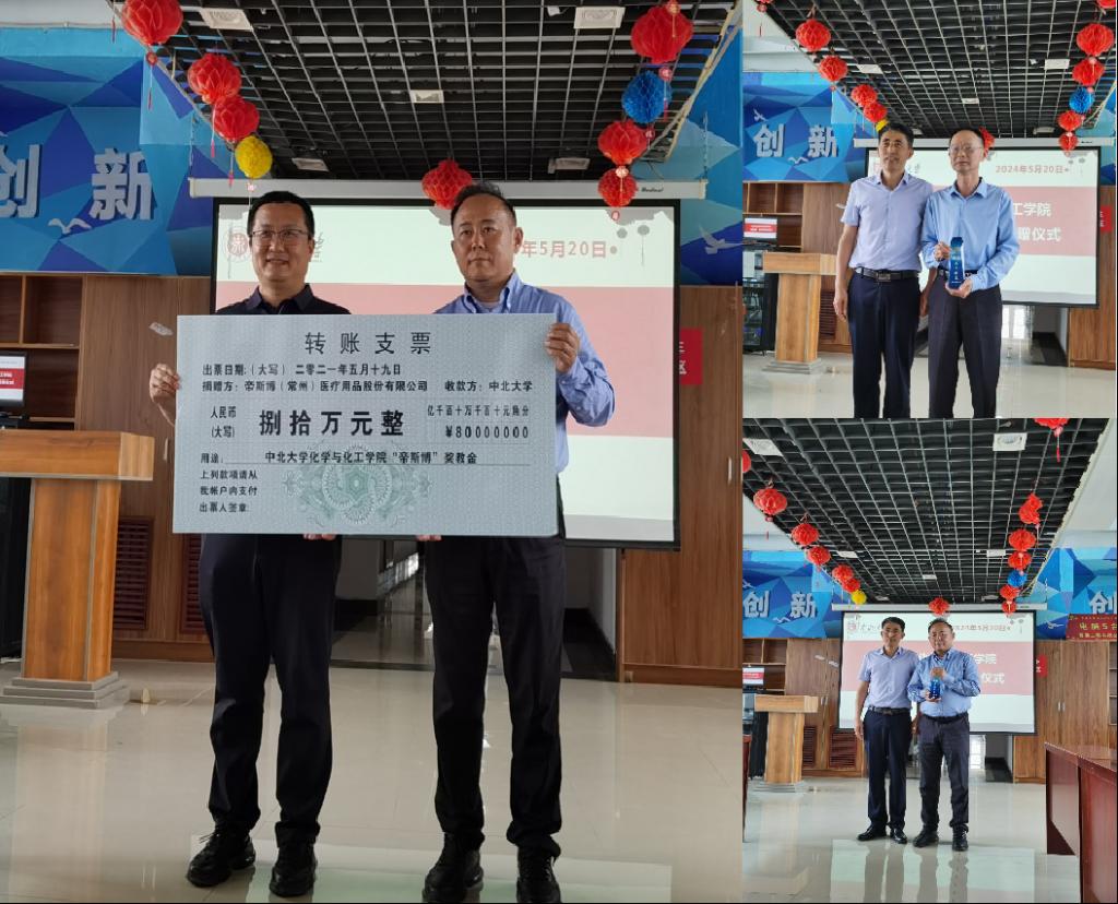 5月20日,我院在科学楼C座7层连廊举办“帝斯博”奖教金捐赠仪式。副校长尹建平对张柱华和韩新萍两位校友的慷慨捐赠予以感谢和赞赏。他表示,学校将继续努力提升教育教学质量,培养更多优秀人才,为社会进步和国家发展作出更大贡献。国内交流合作部部长刘国东接受帝斯博(常州)医疗用品股份有限公司董事长张柱华先生的捐赠,并为张柱华校友颁发捐赠证书。“帝斯博”奖教金获得者代表袁志国教授作了发言。院党委书记吴志远为张柱华和顾冠中两位校友颁发“杰出校友”纪念水晶杯。