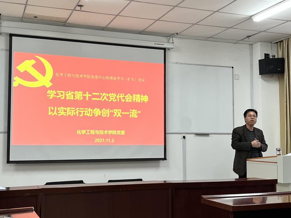 2021年11月3日下午,化学工程与技术学院党委在科学楼C座206会议室组织学习中国共产党山西省第十二次代表大会精神,全体院领导,系主任、党支部书记、科级干部参加了学习,会议由学院党委书记廖海洪主持。