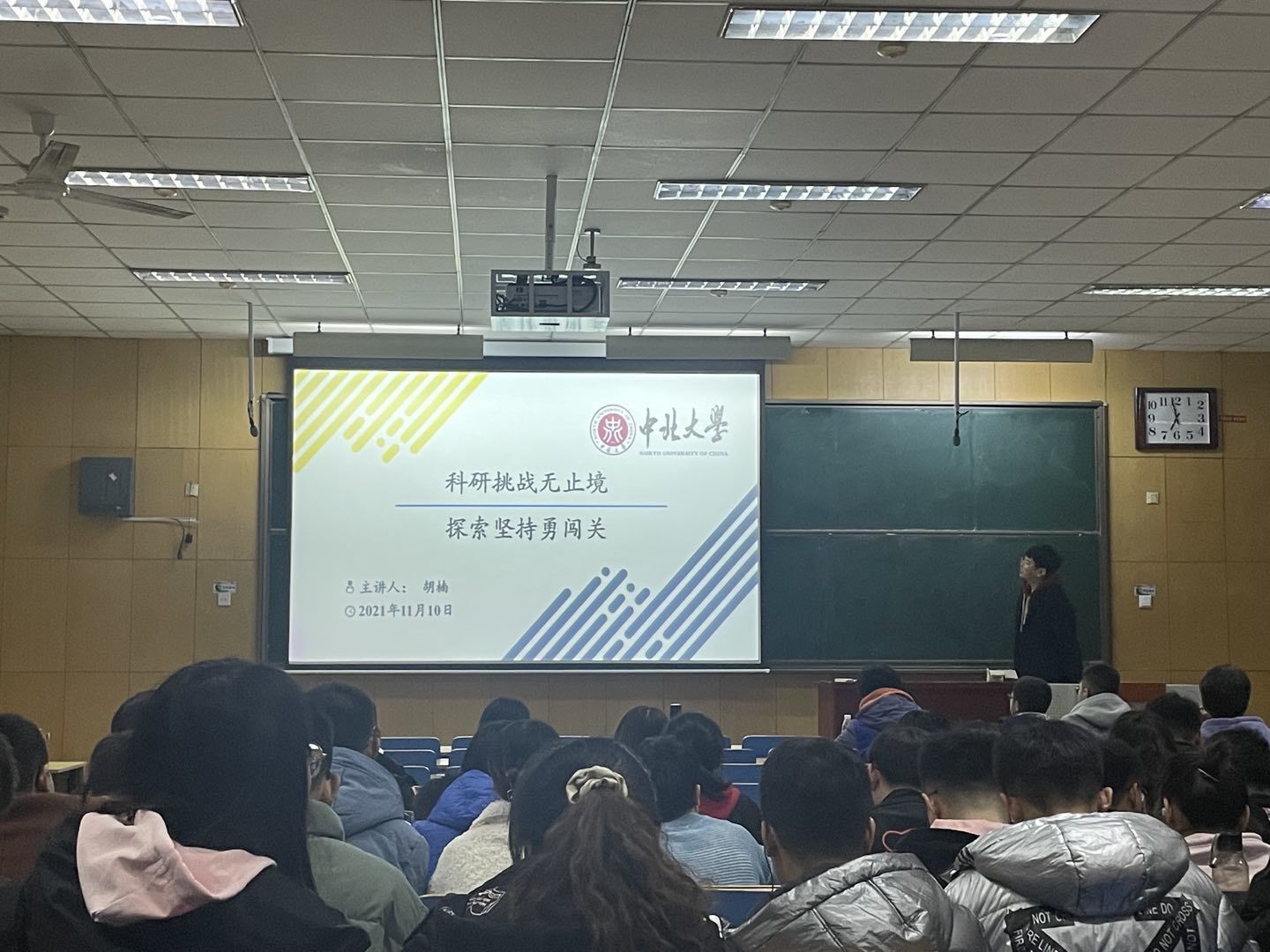 2021级研究生们已经踏入了研究生生活和学习的正轨,为让研究生更好地学会科学规划,并了解前沿学科动态。化学工程与技术学院于2021年11月10日周三晚上7:00,在11209H举办了俊彦讲坛,主题为“科研挑战无止境 探索坚持勇闯关”,由胡楠老师主讲,研一学生参加了此次讲座。