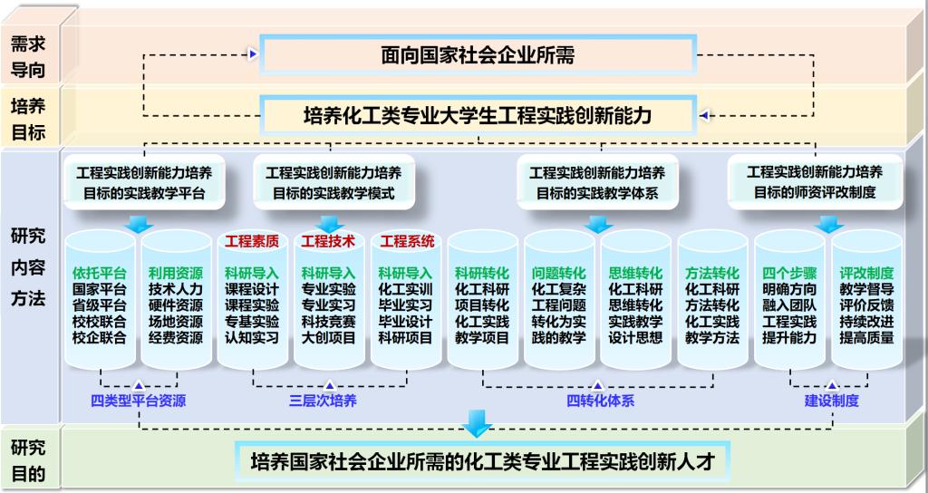 根据国务院、教育部等部门关于《中国教育现代化2035》、《关于深化本科教育教学改革全面提高人才培养质量的意见》等文件精神,针对中北大学化工类专业的化工实践教学体系存在未能突出学生解决化工复杂工程问题的内涵、化工实践教学平台未能聚集优势学科、国家省级平台和高新企业的资源、化工实验教学模式未能形成以学生为中心的多元化教学形态、化工师资队伍建设未能建立可持续协调发展的机制等问题,本成果提出“基于“科研赋能”的化工类专业大学生工程实践创新能力探索与实践”的思想,旨在培养学生解决复杂工程问题的工程实践和创新能力,为国家、社会和企业输送满足所需的化工人才。