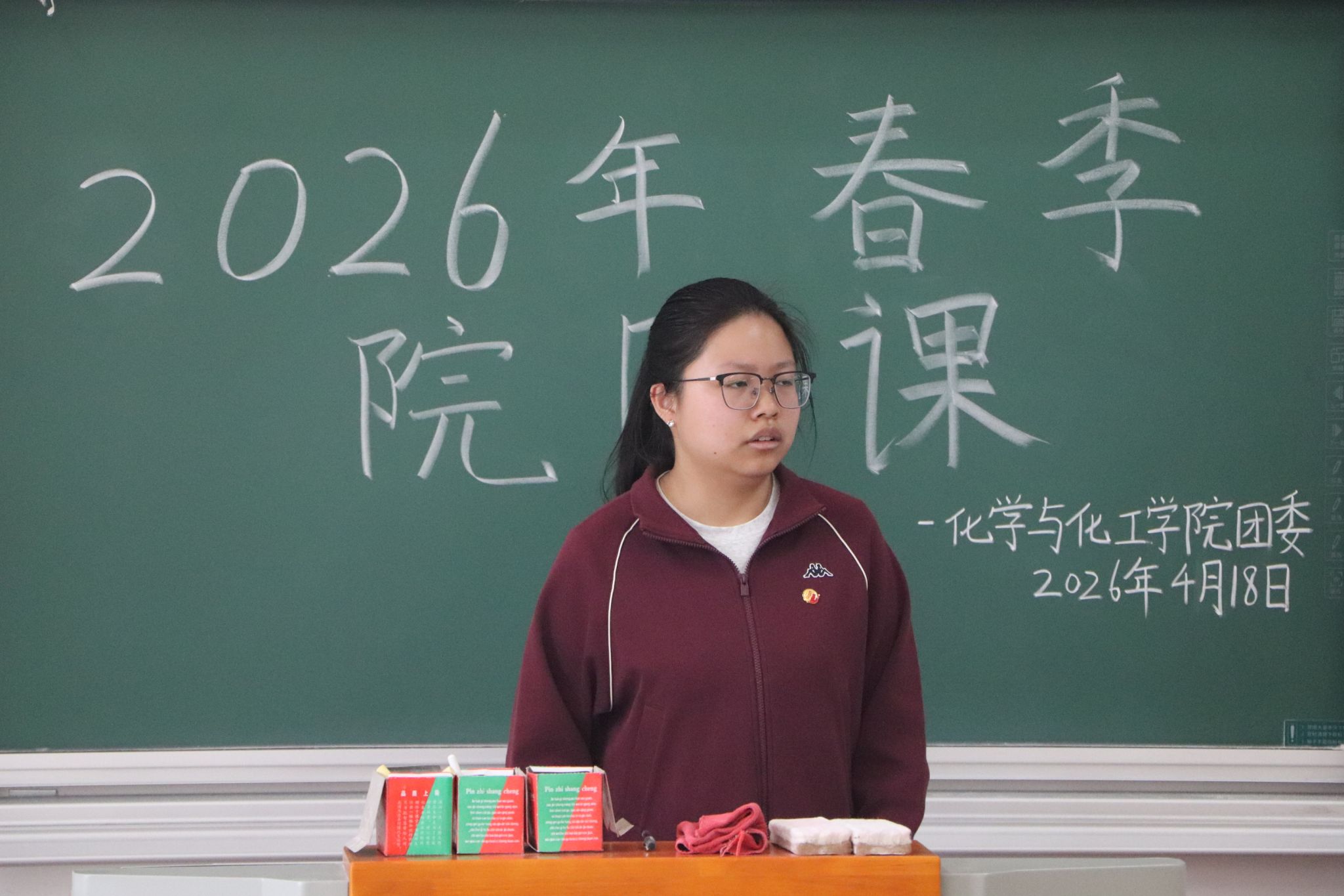 2026年4月18日上午,化学与化工学院团委组织部在17101H开展2026年春季院团课培训。本次团课邀请院团委书记赵芸芳、院学生科副科长秦秀峰及学生代表敖国栋、何雪菲担任主讲,全体入团积极分子参加培训。
