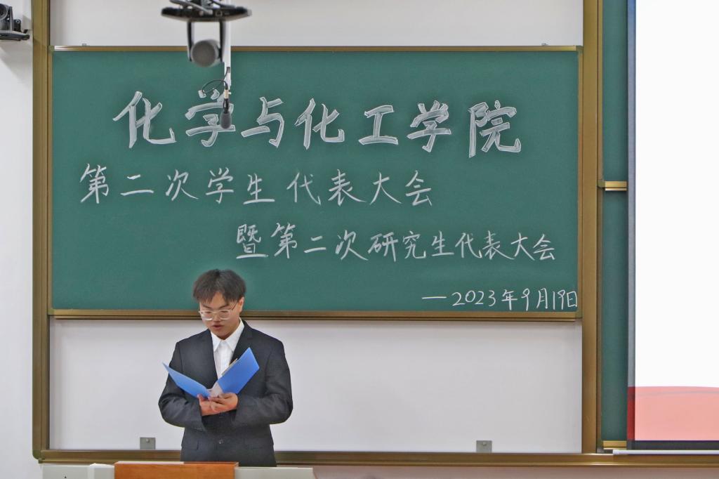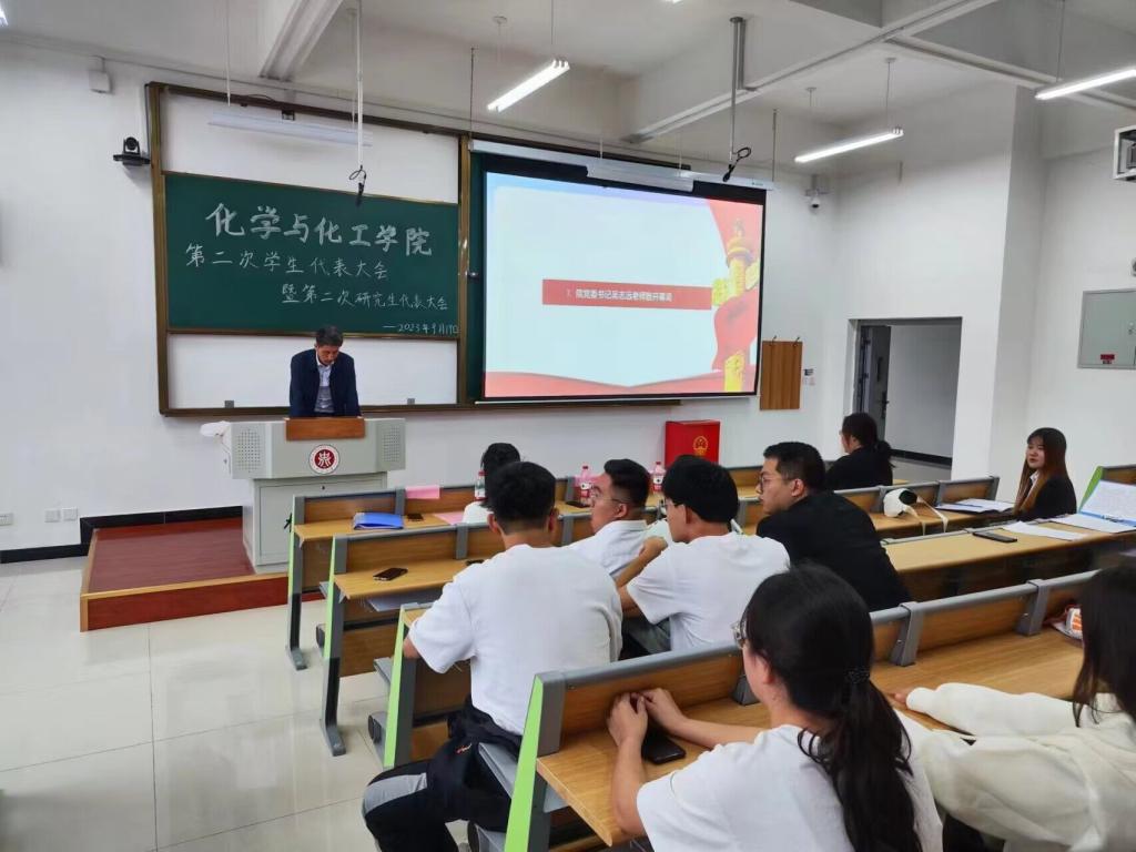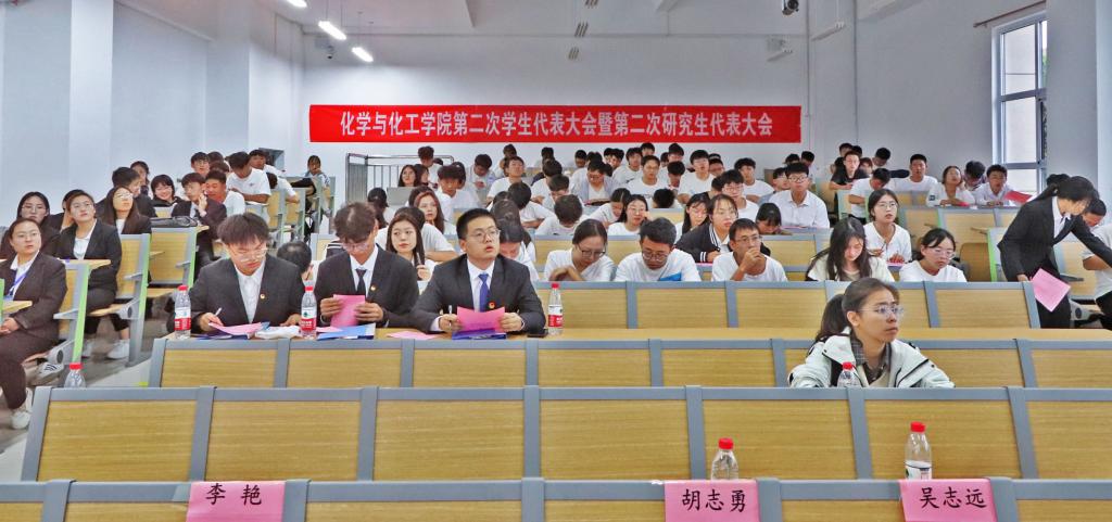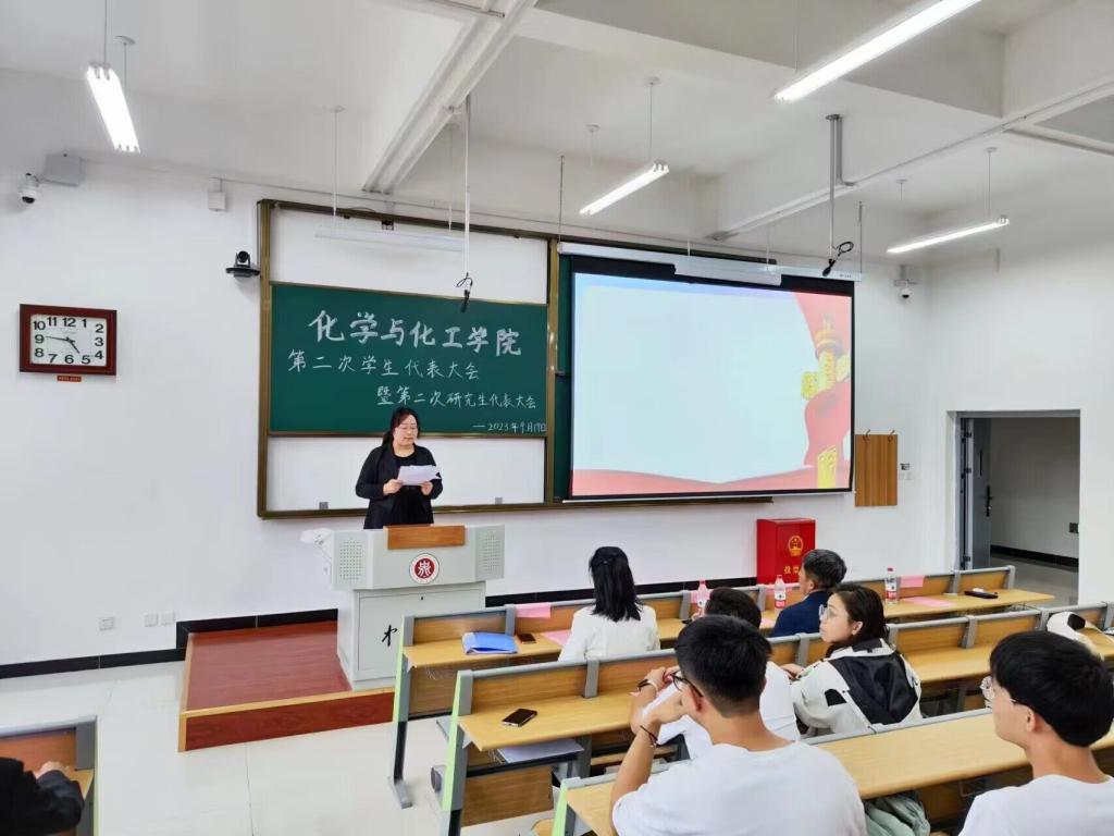2023年9月19日下午中北大学化学与化工学院在17105H教室隆重举行中北大学化学与化工学院第二次学生代表大会暨第二次研究生代表大会。化学与化工学院党委书记吴志远,副院长胡志勇,团委书记李艳和研究生辅导员贾苗苗及全体学生代表115人参与本次会议。会议由化学与化工学院主席团成员何英华主持。