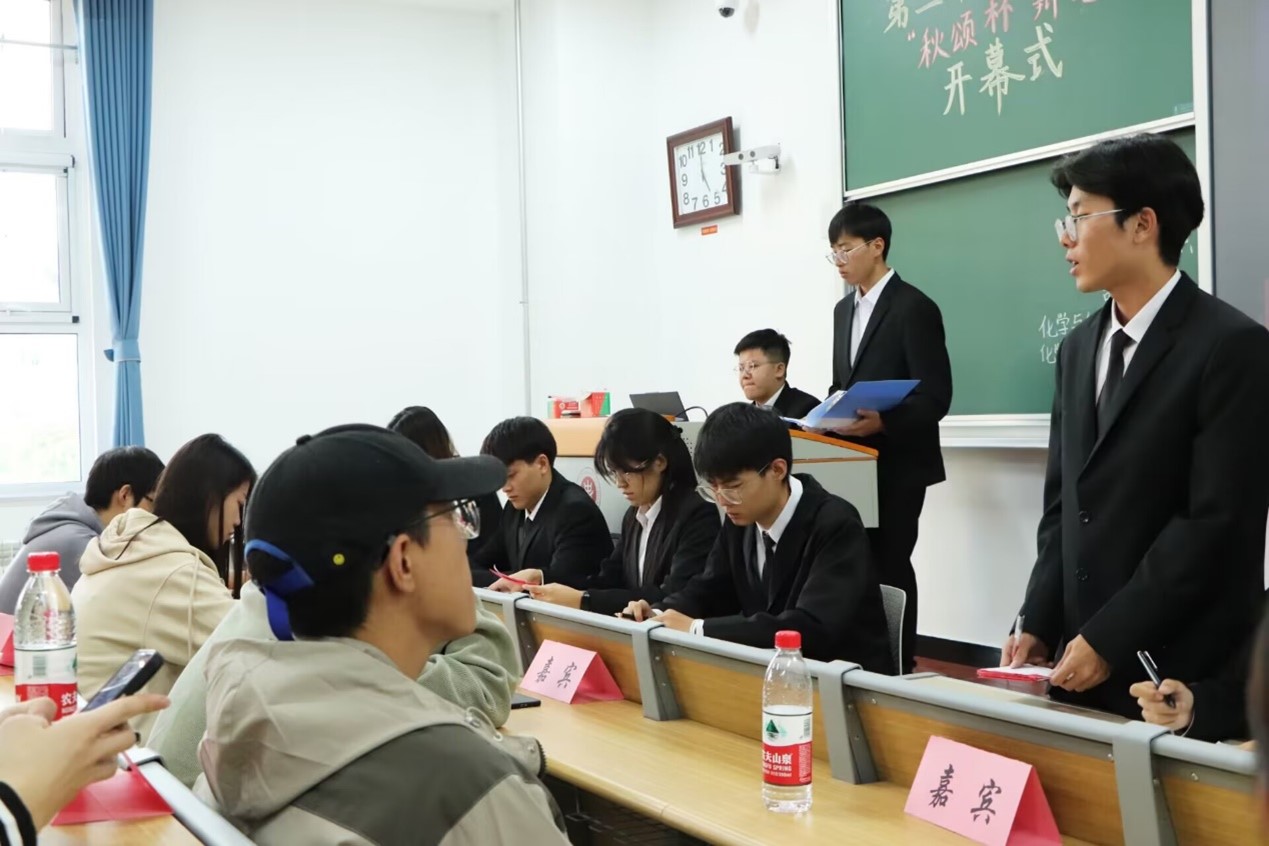 为建设我院优良学风,丰富学生课外活动,培养新生的思辨能力和语言表达能力,化学与化工学院“秋颂杯”开幕式于2023年10月15日下午三点在17101H教室举办。这是一场激烈的讨论,更是一场思维的碰撞,吸引着无数的观众前来观看。出席本次活动的嘉宾有各院辩论负责人,本院各部门学生代表以及我院各级学生志愿者。