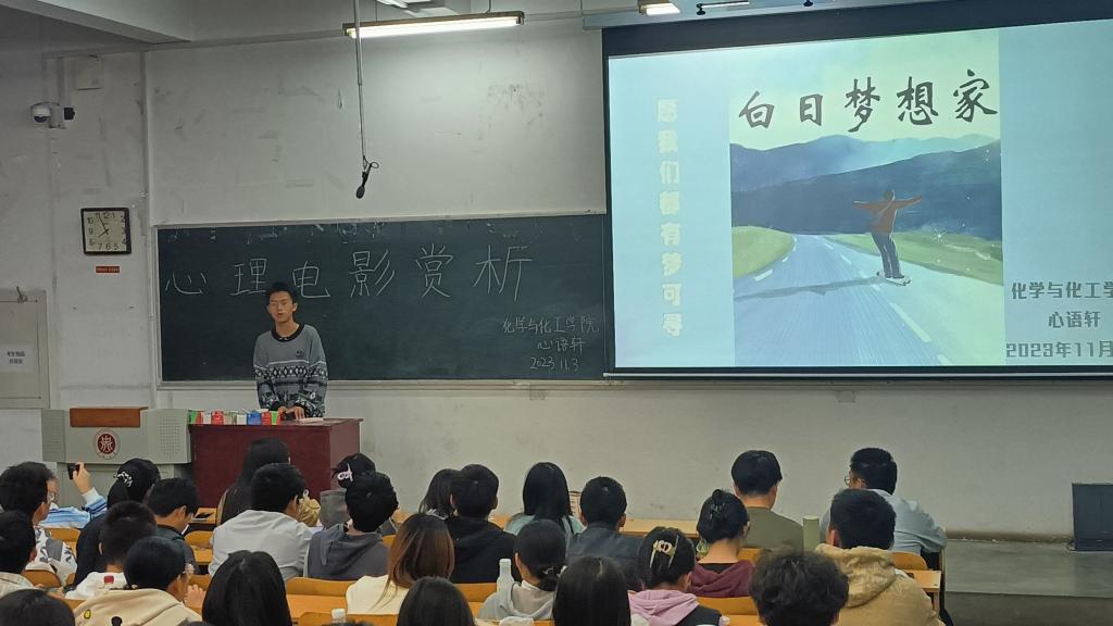 为了丰富同学们的课余生活,舒缓同学们的心理压力,化学与化工学院心理辅导站心语轩于11月3日晚7点在10101H教室播放了本学期第三场心理电影——《白日梦想家》。