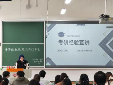 首先,袁丹璐同学结合自身经历讲述了备战考研一定要有计划、有思考的去复习。其次是要根据自身实力和兴趣去选择考研学校和方向。随后,丁欣茹同学耐心的给各位同学讲解了专业知识学习备考的步骤和方式方法,给大家传授了一些考试的小技巧,提醒大家要利用平时的细小时间学习,利用好空闲时间,要多做题,加强练习。要对自己拥有信心,遇到困难问题,要想办法解决,不到最后一刻,坚决不能放弃。赵翔同学分析了当前的复试形势,着重介绍了复试的基本流程及复习方法,就临场发挥、面容着装等面试细节给同学们提出建议,还以亲身经历告诉同学们如何应对面试时的突发事件。白晨曦同学强调积极乐观的心态在整个考研过程中的重要性,同时分享了面试礼仪和面试技巧,面试过程中要充分展现自己的精神面貌、专业素养与综合素质。并就如何获取专业相关信息、如何与导师高效沟通等方面分享了心得体会。