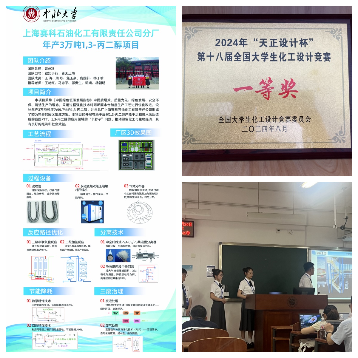 2024年8月16至22日,“天正设计杯”第十八届全国大学生化工设计竞赛全国总决赛在大连理工大学举行。我校化学与化工学院“晋ACE”团队(化学与化工学院2021级化工专业本科生王涛、焦玉豪、周丹、庞国轩、杨丁瑜5位同学组成)完成的作品——“上海赛科石油化工有限责任公司分厂年产3万吨1,3-丙二醇项目”,在工艺选择、设备设计与选型、自动控制、本质安全、清洁生产、三维工厂等方面开拓创新,精彩的汇报展示与答辩得到了评委的一致认可,历经山西省省赛、西北区赛、全国总决赛,从全国450所高校,3685支队伍中,一路拼搏,最终获得西北赛区特等奖、全国总决赛一等奖,并获西北赛区工程图纸与设计文档优秀奖。这是我校自参加全国大学生化工设计竞赛以来,已连续11年代表西北赛区参加全国总决赛,并获得全国一等奖,这一优异成绩体现了中北大学化学与化工学院在人才培养和学科建设方面的工作成果,也彰显了中北大学在化工本科教育领域的引领地位。