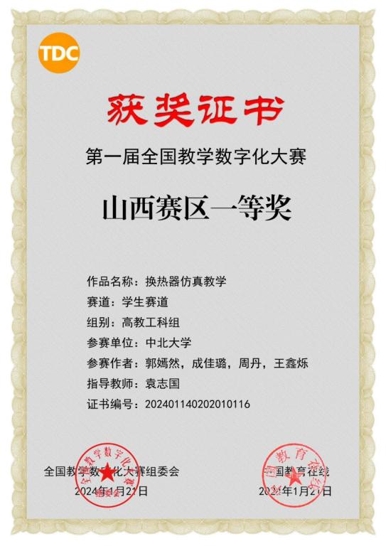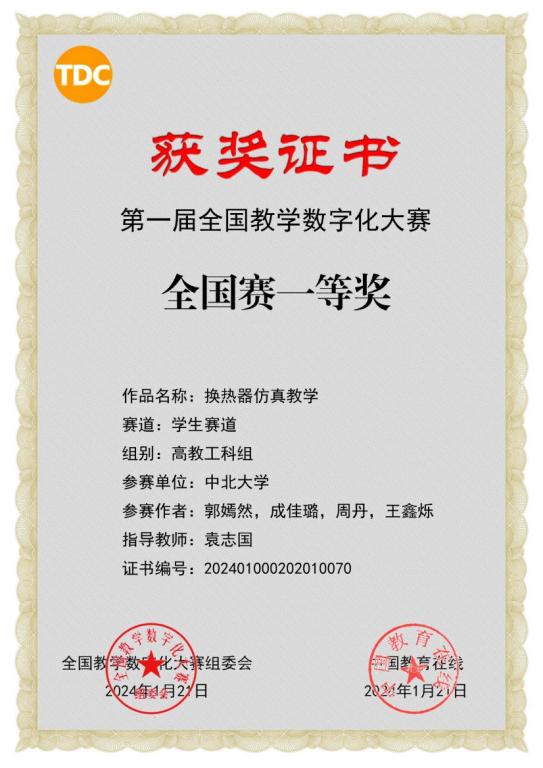 2024年1月19日至21日,由中国教育在线和北京信息科技大学联合主办的首届全国教学数字化大赛全国赛现场决赛在北京信息科技大学落下帷幕。我校化学与化工学院2021级化工专业本科生郭嫣然、成佳璐、周丹、王鑫烁4位同学在袁志国教授的指导下,凭借“换热器仿真教学”项目,获得全国总决赛一等奖。