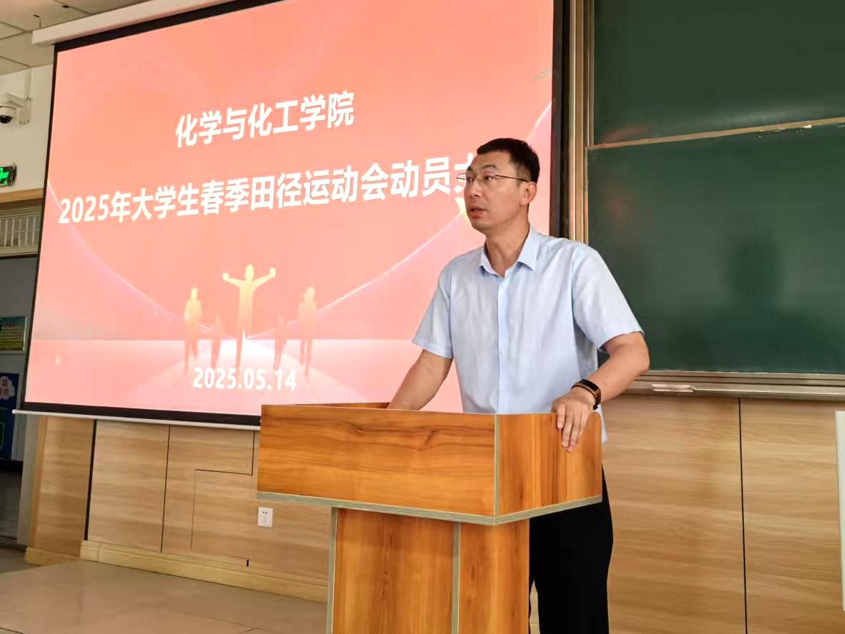 为弘扬体育精神,激发参赛热情,全面部署运动会筹备工作,保障运动会安全、有序进行,2025年5月14日中午,化学与化工学院在09203H召开了2025年大学生春季田径运动会动员大会。学院党委副书记蔡文涛、团委书记李艳、学生科科长赵芸芳、全体辅导员老师、参赛运动员、方阵成员、运动会工作人员、坐场学生、及学生干部等共200余人齐聚一堂、共同吹响备战运动会的集结号。