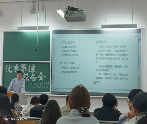 为充分发挥优秀学子的示范引领作用,激励广大学子树立远大理想、砥砺奋进,5月23日下午,化学与化工学院“榜样的力量”优秀学生事迹报告会在17102H顺利举行。学院各专业优秀学生代表及“中北奖章”获奖班级代表担任本次报告会的主讲人,院学生科科长赵芸芳老师及100余名学生共同参与了这场充满正能量的分享盛会。
