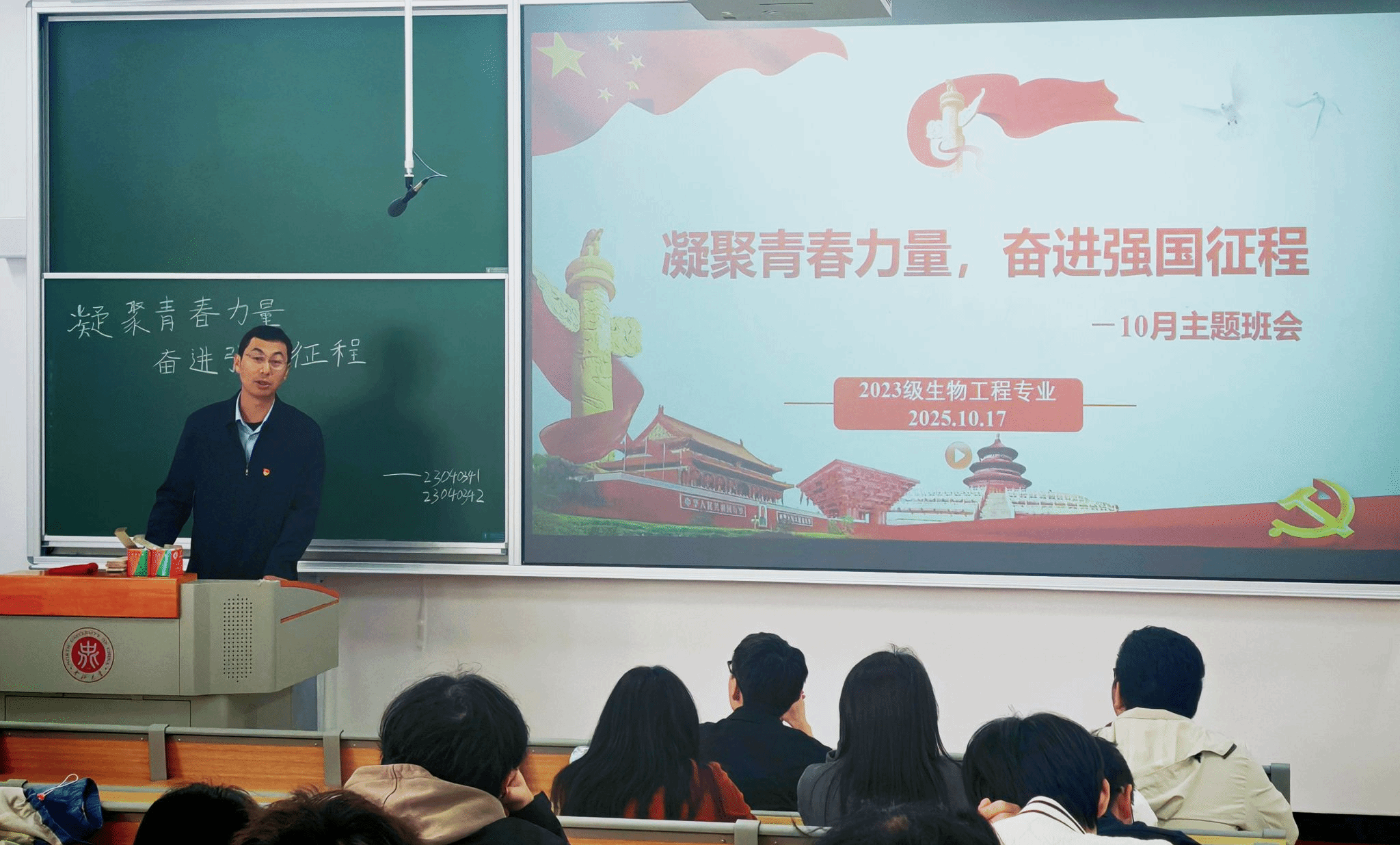 2025年10月17日下午,化学与化工学院生物工程专业在18402H召开主题班会,特邀院党委副书记蔡文涛主讲,蔡文涛围绕学习习近平总书记在“纪念中国人民抗日战争暨世界反法西斯战争胜利80周年大会”上的重要讲话精神,做了题为“铭记伟大历史 担当时代大任”的主题讲座。