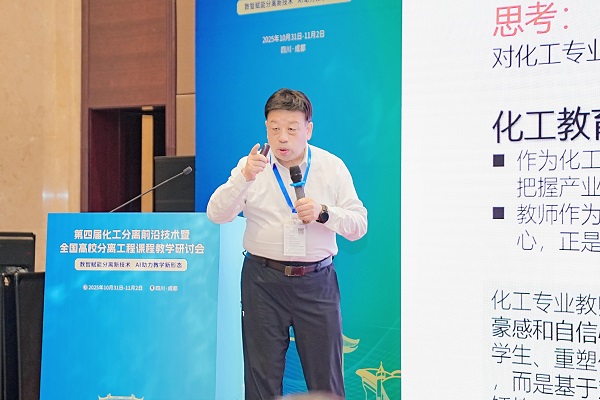 开幕式上,教育部高等学校化工类专业教学指导委员会副主任委员、中北大学刘有智教授代表教指委致辞,刘有智强调研讨会以“数智赋能分离新技术,AI助力教学新形态”为主题,契合时代需求,将有力推动分离工程领域教育教学、人才培养与科学研究的深度融合与协同创新,助力构建教育、科技、人才高效协同的新机制。
