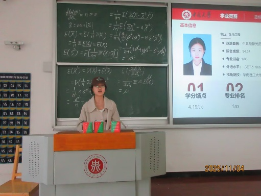 11月4日,生物工程专业新生教育在17101H教室如期举行。胡楠副教授从学科优势、培养模式、竞赛方向、考研规划、就业前景五个方面展开讲解,重点介绍学科竞赛的丰硕成果,激励新生锚定目标、健康生活。学生代表贾梦茹、薛梦迪分别分享竞赛参与、笔记整理、入党成长等经验,勉励学弟学妹主动实践、提前规划人生蓝图。