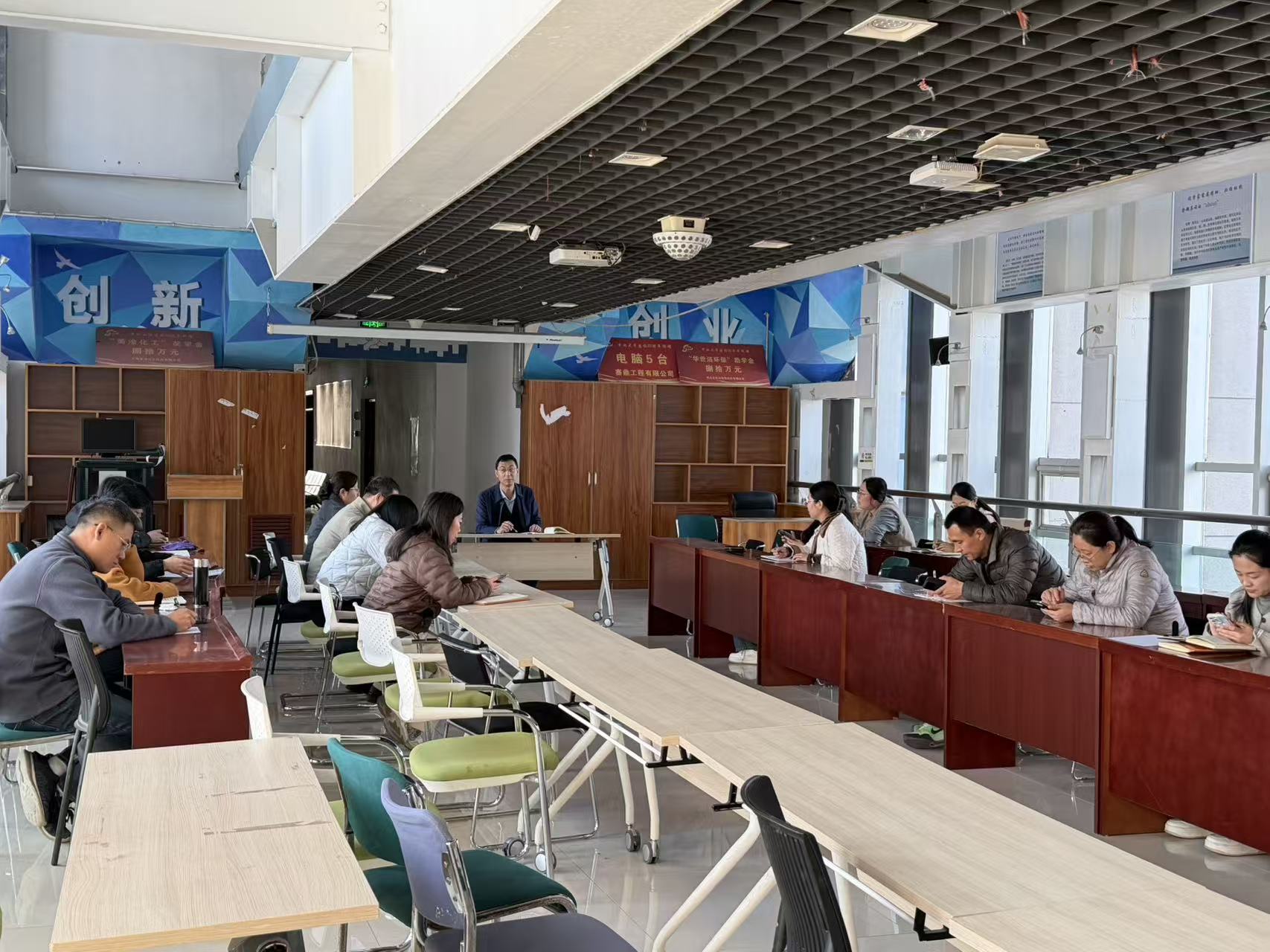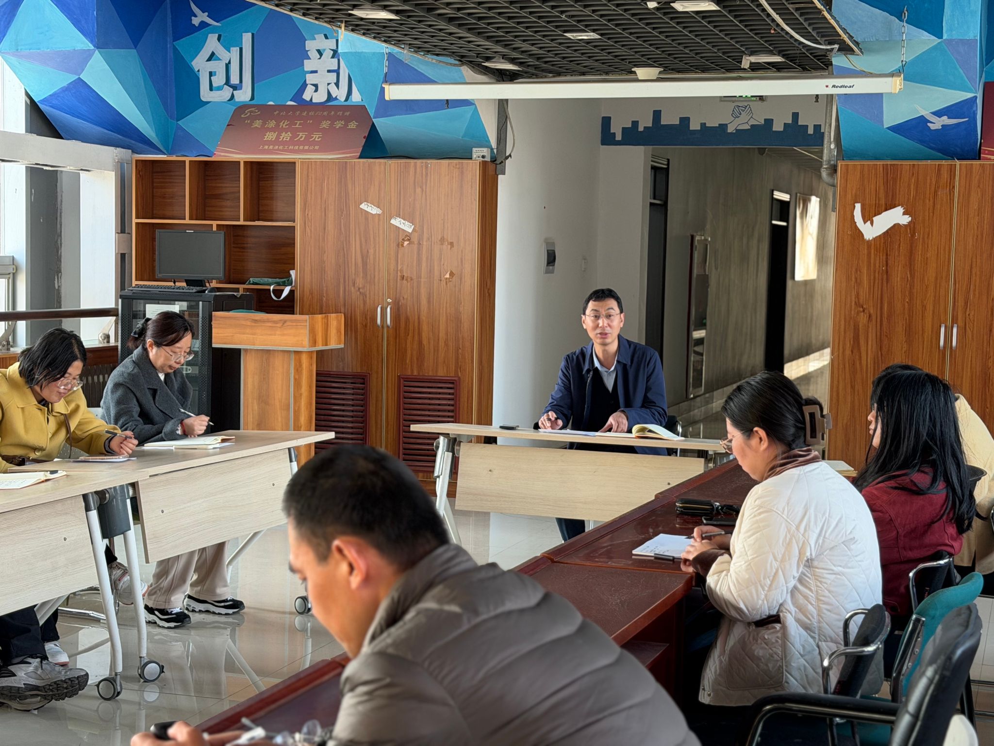 2025年11月11日下午,化学与化工学院在科学楼C座7层连廊召开11月份班主任工作例会。会议由学院党委副书记蔡文涛主持,全体辅导员及班主任参加。会议回顾了10月份工作成效,并围绕学生思想教育、安全、就业指导、学风建设等核心议题,对11月份重点工作进行了全面部署。