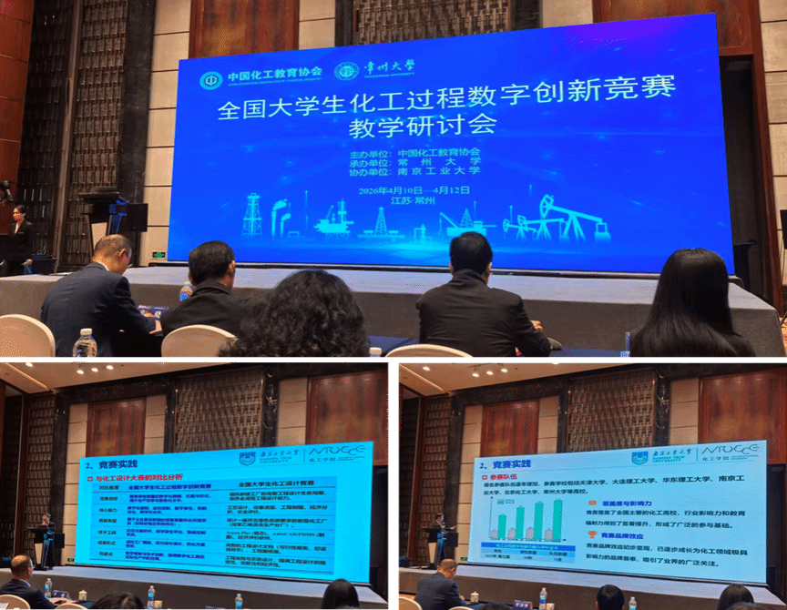 2026年4月10日—12日,由中国化工教育协会主办、常州大学承办、南京工业大学协办的全国大学生化工过程数字创新竞赛教学研讨会在常州顺利召开。化学与化工学院教学院长胡志勇教授带队化工过程数字创新竞赛指导教师马忠平、郭婧、董婷一同参会,开展学习交流与教学研讨。