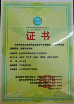 我院生物工程专业李紫玉、严文霞、牛静怡、郭航宇、李志恒、樊玥芸等六位同学凭作品“β-葡萄糖苷酶的固定化及其性能研究”在比赛中荣获创新类三等奖(创新类)指导老师史楠、王海宾。此次大赛获奖展现出我校学子良好的精神风貌,并将促进生物工程专业师生更多参与全国性赛事、开阔眼界,进一步提高教学积极性和专业自信心。