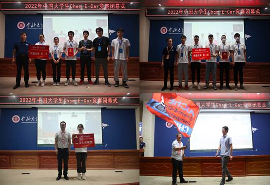 闭幕式由我院副院长焦纬洲主持。余立新对大赛进行了点评,夏淑倩宣读了获奖名单。竞赛性能奖第一至第五名分别为:南京理工大学、贵州理工学院、大连理工大学、中国石油大学(华东)、天津大学;我校获得“最持久表现奖”;我校和大连理工大学荣获“最佳海报奖”;南京工业大学、浙江大学荣获“最佳安全奖”;天津大学荣获“最具创意驱动系统奖”;山东理工大学、中南大学荣获“竞赛精神奖”;安徽师范大学、西安石油大学、石河子大学荣获“杰出体育道德奖”;哈尔滨工业大学(威海)和中山大学荣获“金轮胎奖”;南京工业大学、四川大学荣获“最佳视频奖”。与会领导和嘉宾为获奖队伍颁奖。