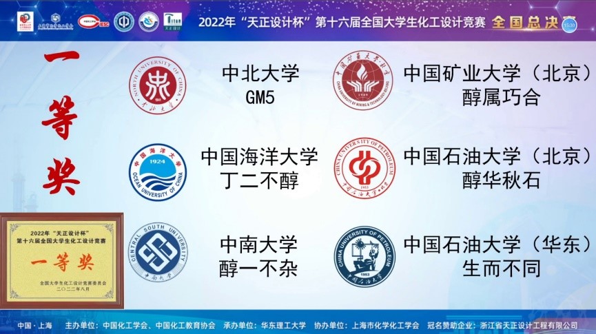 2022年“天正设计杯”第十六届全国大学生化工设计竞赛全国总决赛由华东理工大学承办,于2022年8月16~22日以线上形式举行。经过赛区预选赛,遴选出60支队伍参加全国总决赛。中北大学化学与化工学院“GM 5”团队,一路过关斩将,以西北赛区第一名的优异成绩代表西北赛区参加了全国总决赛,并获得全国一等奖,这是我校连续9年代表西北赛区晋级全国总决赛并获奖。