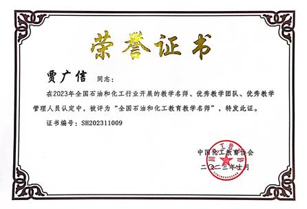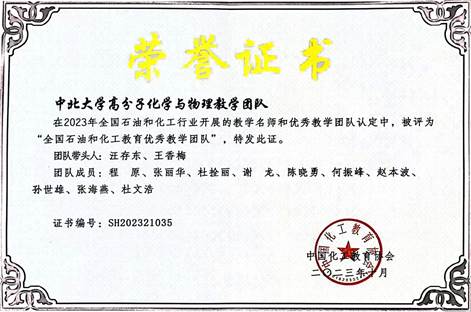 近日,中国化工教育协会发布《关于公布2023年全国石油和化工教育教学名师、优秀教学团队、优秀教学管理人员认定结果的通知》(中化教协发〔2023〕49号)并颁发荣誉证书,授予我院贾广信教授“全国石油和化工教育教学名师”荣誉称号,授予汪存东副教授和王香梅教授负责的高分子化学与物理教学团队“全国石油和化工教育优秀教学团队”荣誉称号。本年度山西高校中只有以上两项荣誉获得认定。此前,我院已有焦纬洲教授和袁志国教授、化工原理教学团队分别获此殊荣。