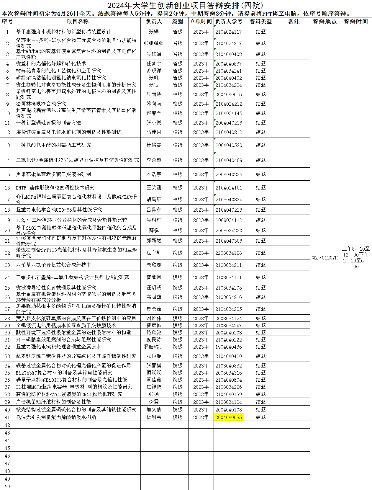 特别强调:1、验收报告必须完整包括实验设计、实验过程、数据表格等结果及分析和实物展示,不能随便两三页就交差,如有发表的论文或专利请一并提交PDF;2、信息采集卡中团队照片请自行将成员照片P成团队照片,并保证清晰度;3、如不在答辩名单中的,请联系教学科添加;4、如遇上课等情况,联系教学科调整答辩顺序。