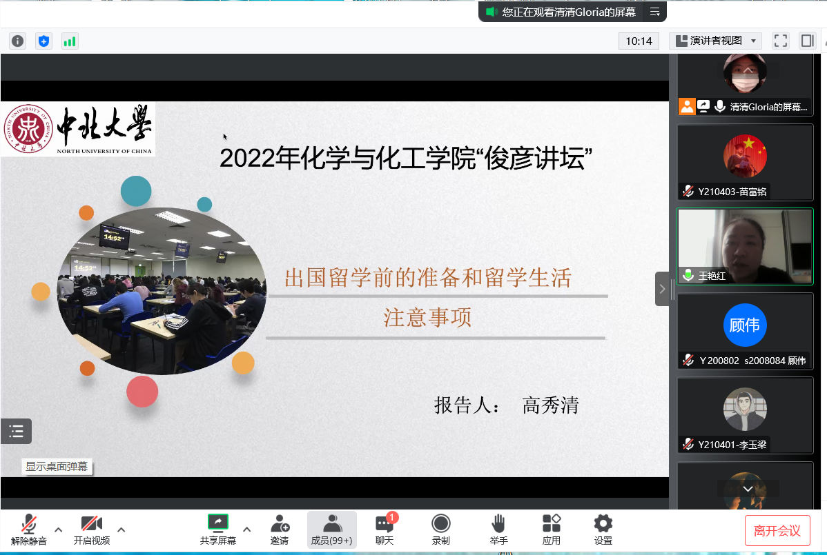 为进一步提高研究生培养质量,加强研究生学术交流,营造浓厚的学术氛围,拓宽研究生的学术视野和知识面,提高研究生科研创新和国际交往能力,2022年10月4日下午3:30,通过腾讯会议,学院邀请了毕业于英国诺丁汉大学的青年教师高秀清老师,开展了一场题为《出国留学前的准备和留学生活》的“俊彦讲坛”讲座,为研究生们进行国际学术交流提供了思路,约300名研究生参加了此次报告。
