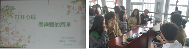 为增进同学间的相互沟通与交流,促进学生身心健康全面发展,11月3日下午,我院在科学楼七层长廊对Y220401、Y220402班举办了主题为“打开心扉,徜徉爱的海洋”的研究生心理团辅活动,活动由化学与化工学院研究生辅导员贾苗苗老师主持。