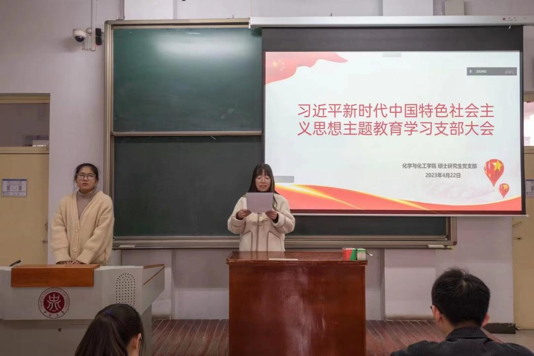 在全党深入开展学习贯彻习近平新时代中国特色社会主义思想主题教育,是党中央为全面贯彻党的二十大精神、动员全党同志为完成党的中心任务而团结奋斗所作的重大部署。为推动主题教育扎实开展、营造良好学习氛围,化学与化工学院硕士研究生党支部于2023年4月22日下午3点在11211H开展“学习贯彻习近平新时代中国特色社会主义思想”主题教育第一次集中学习。