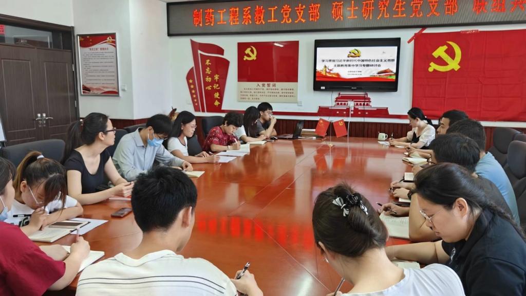 2023年6月30日上午10:00在科学楼七层党员之家,化学与化工学院硕士研究生党支部联合制药工程系教工党支部以“联组共学”的方式,就“学习贯彻习近平新时代中国特色社会主义思想”主题教育进行学习研讨。本次会议由制药工程系教工党支部书记王立敏老师主持,支部所有党员参会。