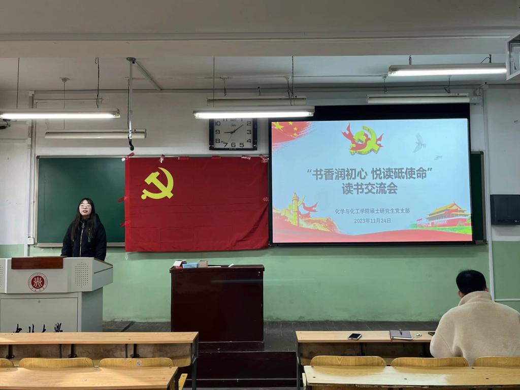 为筑牢信仰之基、补足精神之钙、把稳思想之舵,化学与化工学院硕士研究生党支部于11月13日——12月13日举办主题为“书香润初心 悦读砥使命”的读书交流会,阅读《为了初心和使命——中国共产党一路走来的故事》及《为了可爱的中国——党员知识分子的初心与使命》两本书籍,支部每周制定学习计划,由六个读书小组根据学习内容每周带头学,已完成六期学习;支部于2023年11月24日上午9:30在01207H教室开展了一次集体学习,支部全体党员参会。