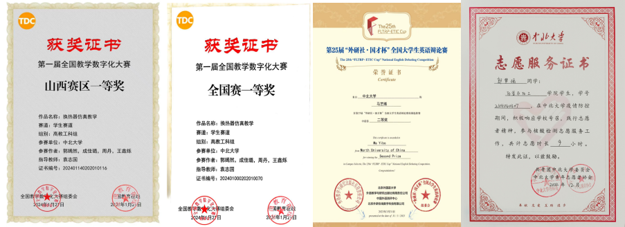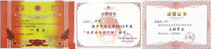 ●所获荣誉:第二届全国大学生化工过程数字创新竞赛 全国特等奖、第十八届全国大学生化工设计大赛 全国二等奖、化工类仿真创新应用大赛 全国三等奖、2023年刘鼎杯大学生创新创业大赛 校级三等奖、2023年大学生创新创业项目 校级立项并结项、高教杯用外语讲好中国故事 校级二等奖、“敬廉崇洁,知诚讲信”主题演讲比赛 校级二等奖、2022/2023学年 三好学生、2023/2024学年 三好学生 、青年廉洁社2023年度“优秀主讲人”、2023年度“优秀共青团员“、2021年 勤工助学保洁队优秀个人、2023年 勤工助学教学楼服务队优秀个人、2023/2024学年 “五星级宿舍”