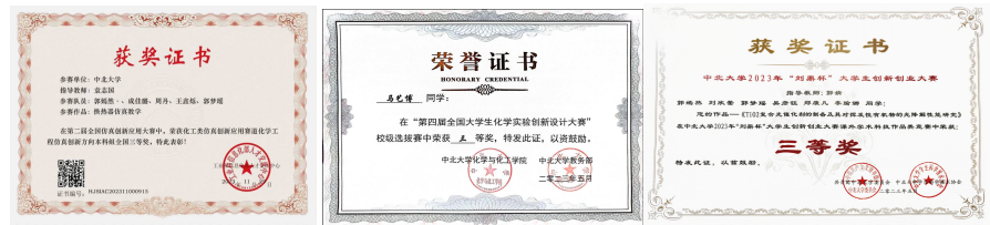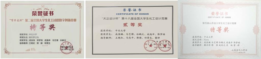 ●所获荣誉:“百子尖杯”第二届全国大学生化工过程数字创新竞赛全国特等奖,“天正设计杯”第十八届化工设计大赛全国二等奖、省级特等奖