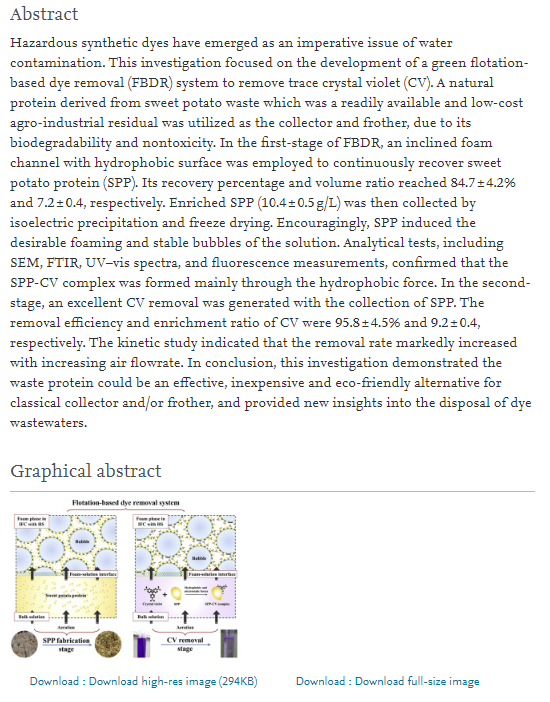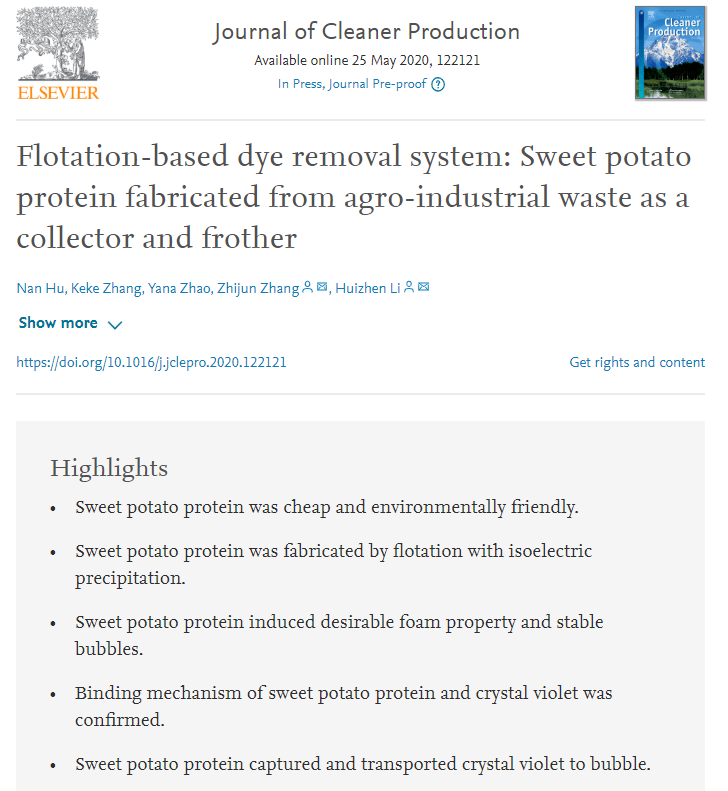 近日,化学工程与技术学院本专业教师胡楠博士为第一作者,张志军教授为通讯作者的论文“Flotation-based dye removal system: Sweet potato protein fabricated from agro-industrial waste as a collector and frother”被环境工程领域国际权威期刊Journal of Cleaner Production录用刊发。https://doi.org/10.1016/j.jclepro.2020.122121