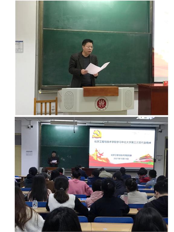 2021年10月14日下午,在11505H,化学工程与技术学院党委组织全体党员学习中国共产党中北大学第三次代表大会会议精神,会议由学院党委书记廖海洪主持,全体党员参加了本次学习。