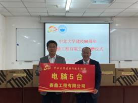 捐赠仪式上,赛鼎工程有限公司向中北大学捐赠电脑五台,院长祁贵生接受捐赠并向赛鼎工程有限公司施福富总工颁发捐赠证书。祁院长对施福富总工、谷磊正高工莅临中北大学并出席中北大学建校八十周年系列活动表示热烈欢迎,并对赛鼎工程有限公司长期以来的支持和帮助表示衷心感谢,希望双方进一步深化交流合作,加强成果转化与技术合作。