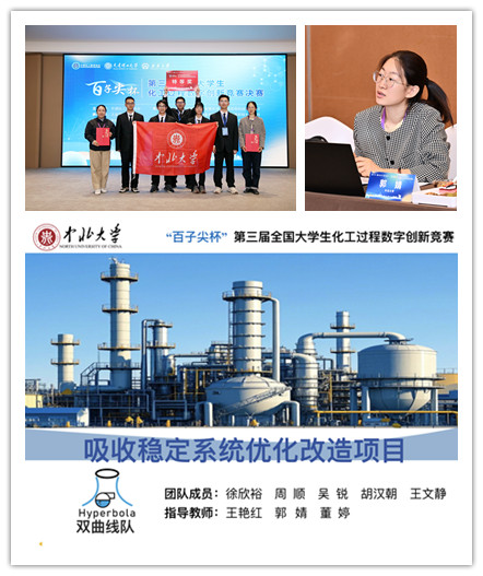 2025年5月23日至5月25日,由中国化工教育协会主办、大连理工大学承办、新疆大学协办的“百子尖杯”第三届全国大学生化工过程数字创新竞赛全国总决赛在大连顺利举办。中国化工教育协会秘书长辛晓、大连理工大学、南京工业大学、新疆大学等多位教育部化工类专业教指委委员及院领导出席活动。中北大学化学与化工学院王艳红与郭婧老师带队参加了本次竞赛的全国总决赛。大赛共吸引了全国120所高校队伍参赛,经过提交作品、专家网评,最终本科生有58支队伍进入全国总决赛。中北大学代表队获得第三届全国大学生化工过程数字创新竞赛全国总决赛特等奖及优秀指导教师奖。