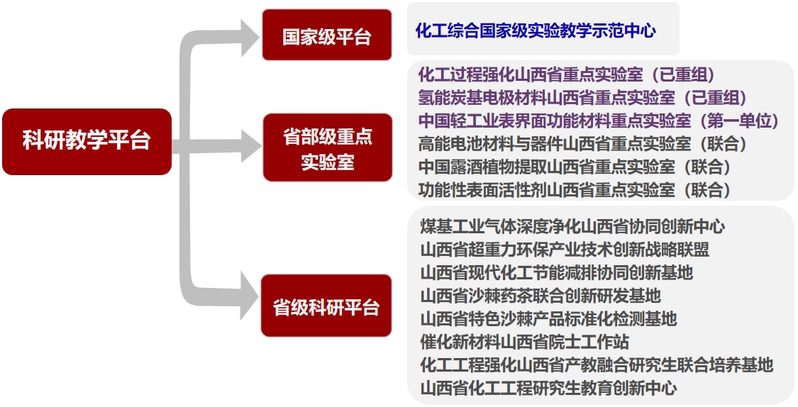 荣获第三届全国创新争先奖1人,何梁何利基金“科学与技术创新奖”1人,光华工程科技奖1人,国家高层次人才特殊支持计划领军人才1人,国家重大人才工程青年学者1人,享受政府特殊津贴专家3人,侯德榜化工科学技术奖3人,全国石油和化工教育教学名师3人,山西省“青年三晋学者”特聘教授2人,山西省学术技术带头人4人,山西省高等学校131领军人才工程7人,山西省新兴产业领军人才3人,山西省高校优秀青年学术带头人3人。
